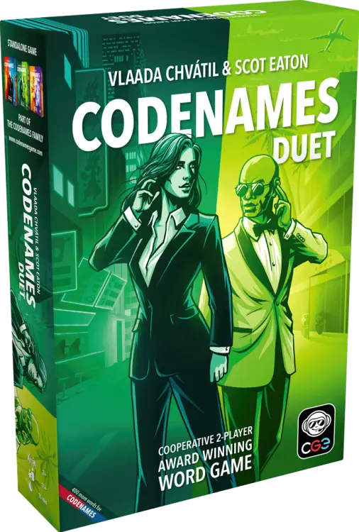 Jij en je partner zijn op een geheime missie in een drukke stad. Je moeten contact maken met 15 spionnen en de vijandelijke huurmoordenaars ontwijken. Jij weet met welke spionnen je partner veilig kan contacteren. Jouw partner weet dat voor jou. Geef elkaar aanwijzingen van één woord die op meerdere woorden slaan en probeer om alle spionnen te vinden, voordat de tijd op is. Codenames Duet is een coöperatief spel voor twee (of meer) spelers.