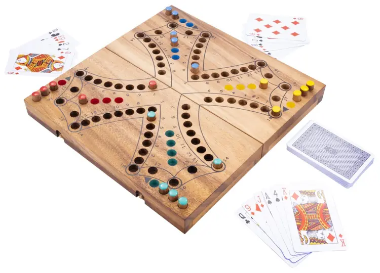 Keezen cassette Acacia hout Vouwbare cassette Speelbord voor 4 spelers Bij keezen doet men de zetten met speelkaarten. Inclusief 1 deck speelkaarten Maat kist gesloten 26 x 13 x 4,8 cm.