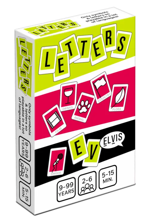 Het pocketformaat kaartspel Letters is een snel woordspel dat in iedere broekzak past (9,0 × 6,0 × 1,9 cm dus brievenbuspost) en veel spanning en lol brengt! Dit compacte gezelschapsspel is geschikt voor grote groepen (2-6 spelers van 9-99 jaar); vrienden, familie, collega's of wie dan ook! En je speelt het overal; thuis, in de kroeg, onderweg of op kantoor! Je probeert zo snel mogelijk een antwoord te roepen dat past binnen de getoonde categorie en start met de getoonde beginletter. Maar... als je al een letterkaart verzameld hebt, wordt het moeilijker want dan moet je ook die letter in je antwoord verwerken! De eerste speler die 3 letterkaarten verzameld heeft, wint een punt. De eerste speler met 3 punten wint! Dit partyspel (dat 'eco friendly' gemaakt is van FSC karton in een 100% biologisch afbreekbaar cellofaantje) levert veel gezelligheid maar vraagt wel iets van je algemene kennis, woordenschat en reactievermogen! Perfect voor Kerst, Oudjaarsavond, een vriendenavond, een familiefeest of gewoon zomaar! Inhoud 54 speelkaarten (met aan de ene kant een categorie en de andere kant een letter) 2 spelregelkaarten Highlights Pocketformaat – past in elke broekzak / brievenbuspost Geschikt voor 2-6 spelers van 9-99 jaar Roep snel een antwoord dat past binnen de categorie en start met een bepaalde beginletter! Vraagt iets van je algemene kennis, woordenschat en reactievermogen! Met iedereen te spelen; vrienden, familie of collega's Overal te spelen; thuis, in de kroeg, op kantoor of onderweg