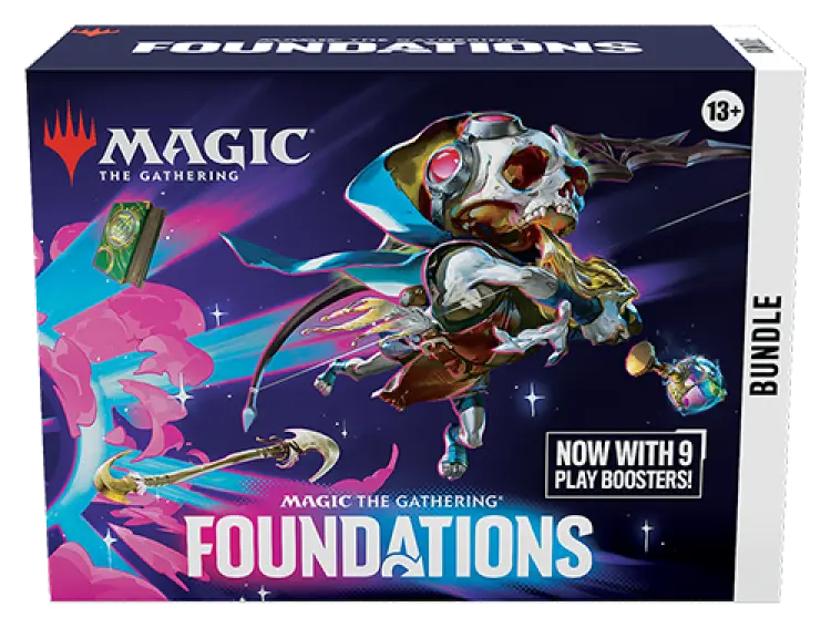 In this Bundle you’ll find 9 Foundations Play Boosters (each containing 14 cards), plus 1 Traditional Foil card with Bundle-exclusive alternate art, 20 Traditional Foil Basic Land cards (10 with Full Art), 20 nonfoil Lands (10 with Full Art), 1 oversized Spindown life counter, 1 Foundations card storage box, and 2 reference cards.