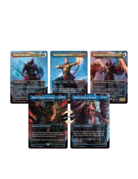 "Do not be sorry, be better." After carving a path of vengeance through Mt. Olympus, Kratos wandered for many years—eventually making his way to the mysterious Norse lands. Following the death of his wife, Kratos and his young son, Atreus, embark on a journey to honor her final wishes, entangling them with the Aesir gods and leading them on a path to eventually face the cataclysmic event of Ragnarök. Empower the father and son duo on the battlefield through Teferi's Ageless Insight as Mimir (the reversible treatment allows you to play either Mimir-in-a-tree or Mimir-as-a-head) and Iroas, God of Victory given form as the indomitable warrior, and "Freya, Queen of the Valkyries."