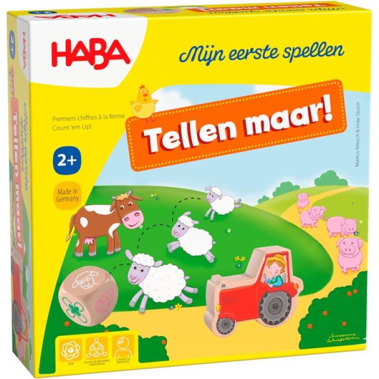 Voer samen met boer Tim zijn lieve dieren en leer meteen tellen! De dieren van boer Tim springen met zijn allen in het rond, waardoor hij totaal geen overzicht meer heeft. Rol de dobbelsteen en beweeg boer Tim in zijn trekker vooruit. Kom je op een klaverblad terecht, dan heb je geluk, want dan mag je de dieren een blad voeren. Wie het laatste klaverblad weet te voeren, wint het spel. Met dit spel leren kinderen spelenderwijs tot 12 tellen, en net als de andere spellen uit de 'Mijn eerste spellen' serie is dit een goed spel om kinderen voor het eerst kennis te laten maken met spelregels, op de beurt wachten en andere sociale aspecten die bij het spelen van een spel aan bod komen. Een leuk spel, goed voor uren speelplezier!