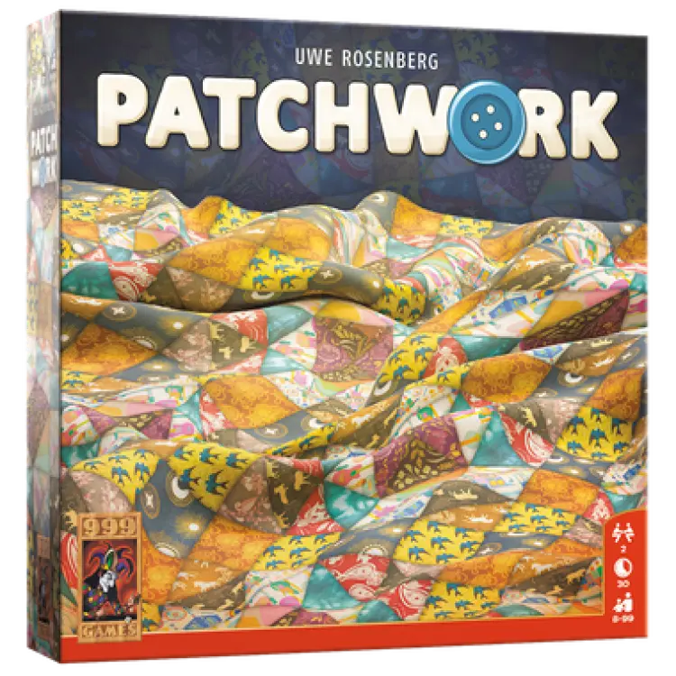 Toegankelijk, tactisch tweepersoonsspel. Probeer zoveel mogelijk lapjes op je dekentableau te leggen. Zorg niet alleen dat het lapje past, maar houd ook rekening met de tijd die het inpassen kost en de inkomsten die het in knopen genereert. Uiteindelijk krijg je namelijk zoveel punten als het aantal knopen dat je hebt minus tweemaal de onbebouwde velden op je speelbord. Bouw je als eerste een deken van 7 x 7, dan scoor je bonuspunten! In Patchwork zijn jullie niet persè afwisselend aan de beurt. Wie in tijd achterloopt, is zolang aan de beurt tot zijn tijdsteen de ander heeft ingehaald. Dit kan leiden tot interessante dilemma's. Omdat de lapjes altijd in een andere volgorde om het speelbord liggen, is geen spel gelijk. Door de eenvoudige spelregels in combinatie met tactische uitdaging is Patchwork leuk voor iedereen!