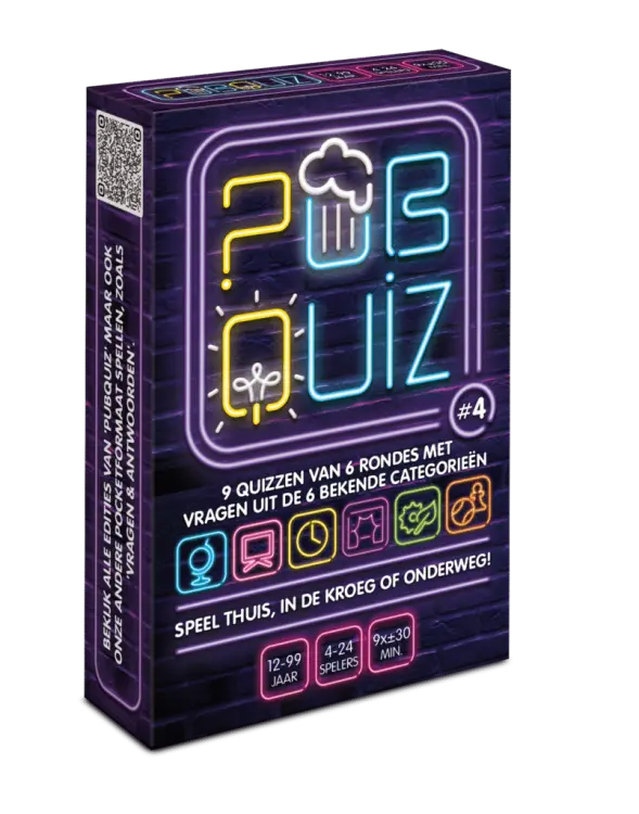 Het pocketformaat quizspel / partyspel Pubquiz – Editie #4 (over 2025) past in iedere broekzak (9,0 × 6,0 × 1,9 cm dus brievenbuspost) en speel je met vrienden, familie of collega's in de kroeg, thuis, onderweg of zelfs online via videobellen! De compacte quizbox bevat 9 complete pubquizzen met in totaal 198 Nederlandse vragen, bijna allemaal over het jaar 2025! Perfect voor avonden vol spanning, humor en strijd. Het triviaspel (dat 'eco friendly' gemaakt is van FSC karton in een 100% biologisch afbreekbaar cellofaantje) is ideaal voor groepen (4-24 spelers van 12-99 jaar): vorm minimaal 2 teams van 2 of meer spelers en speel 6 rondes per quiz. De quizmaster leest de vragen en naderhand ook de antwoorden voor, de teams schrijven hun antwoorden en kijken naderhand elkaars antwoorden na. Welk team behaalt de hoogste score? Wedden dat jullie nog een (quiz)rondje doen! Pubquiz editie #4 is los te spelen maar ook als uitbreiding op editie #1 en #2 en #3. Inhoud 9 complete pubquizzen (over 2025) / per quiz 6 rondes 55 kaarten (54 quizkaarten + 1 spelregelkaart) Categorieën Geografie • Amusement • Geschiedenis • Kunst & Cultuur • Natuur & Wetenschap • Sport & Hobby Highlights Pocketformaat – past in elke broekzak / brievenbuspost Simpele regels dus je begint direct met spelen Geschikt voor grote groepen (4-24 spelers van 12-99 jaar) Je neemt gezellig het jaar nog eens door en steekt er iets van op! Overal te spelen; thuis, in de kroeg, onderweg of tijdens videobellen Editie #4 is los te spelen maar ook als uitbreiding op editie #1 en #2 en #3 'Eco friendly': gemaakt van FSC-karton en verpakt in 100% biologisch afbreekbaar cellofaan 20+ jaar ervaring in het maken van quizvragen Pubquiz – Editie #4 (over 2025); klein doosje, klein prijsje, groot plezier!
