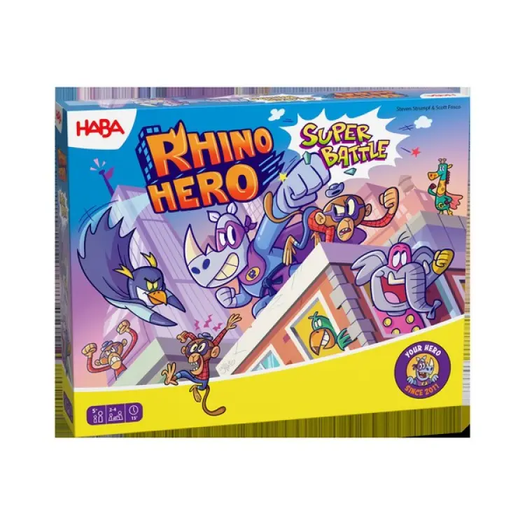Er zijn problemen in Rhino City! Verschillende superhelden vechten het uit op de daken, maar pas op, want deze wolkenkrabbers zouden zomaar eens in kunnen storten! In dit spannende behendigheidsspelletje bouw je wolkenkrabbers van kartonnen onderdelen. Vervolgens ga je met jouw gekozen superheld het gevecht aan tegen de andere superhelpen. Bouw de wolkenkrabbers voorzichtig op en zet je held tactisch neer, want één verkeerde beweging zou de laatste kunnen zijn. Rhino Hero - Super Battle is een spannend spel voor de hele familie en al geschikt voor kinderen vanaf 5 jaar. Heb jij een vaste hand en stalen zenuwen? Dan word jij misschien wel de winnaar!