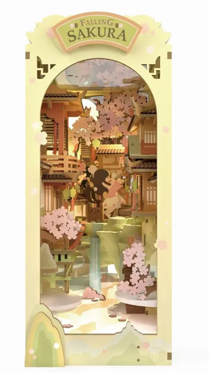 De TGB05 Robotime Book Nook Falling Sakura is een prachtig houten bouwpakket van Rolife, geschikt voor volwassenen en jongeren vanaf 14 jaar. Dit model brengt de charme van de Sakura-traditie tot leven, met bloeiende kersenbloesems en oosterse geveltjes met puntige daken langs een kabbelende rivier en een sierlijke waterval. Tussen de zachte roze tinten bevindt zich een schattig meisje met konijnenoren en een vrolijke roze kauwgombel, terwijl een nieuwsgierige poes zich ergens verstopt.
