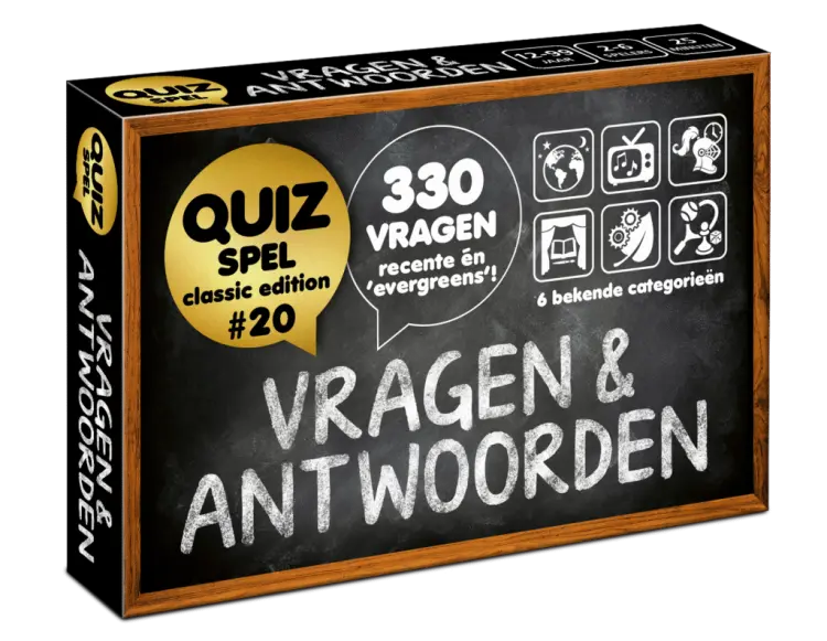 Het pocketformaat quizspel / triviaspel Vragen & Antwoorden – Classic Edition #20 (*** 2025 editie ***) past in iedere broekzak (9,0 × 6,0 × 1,9 cm dus brievenbuspost) en test je kennis met maar liefst 330 gloednieuwe Nederlandse quizvragen - waarvan een groot deel over 2025, aangevuld met tijdloze klassiekers - gemaakt door Marian van Eupen; dé quizvragenmaker van Nederland! Dit compacte, leerzame en vooral gezellige vragenspel maakt van elk moment een quizmoment voor 2-6 spelers van 12-99 jaar! Speel het overal; thuis, op kantoor, in de kroeg, onderweg of zelfs online via videobellen. Met vrienden, familie of collega's. Vragen & Antwoorden #20 is los te spelen maar ook als uitbreiding op editie #1 t/m #19 en andere bekende trivia spellen! Inhoud 330 Nederlandse quizvragen (iedere kaart heeft 6 vragen op de voorkant en de 6 antwoorden op de achterkant) 55 kaarten (1 spelregelkaart + 54 quizkaarten (iedere kaart heeft de 6 bekende categorieën; hemel & aarde, beeld & geluid, vroeger & later, kunst & cultuur, natuur & wetenschap en sport & hobby Highlights Pocketformaat – past in elke broekzak / brievenbuspost 330 Nederlandse quizvragen; grotendeels over 2025, aangevuld met tijdloze klassiekers Simpele regels dus direct beginnen Te gebruiken als zelfstandig quizspel of als uitbreiding bij bekende trivia spellen Geschikt voor 2-6 spelers van 12-99 jaar Pocketformaat → past in je zak en verstuurd als brievenbuspost 'Eco friendly': gemaakt van FSC-karton en verpakt in 100% biologisch afbreekbaar cellofaan Ook leuk voor je eigen pubquiz of tijdens videobellen