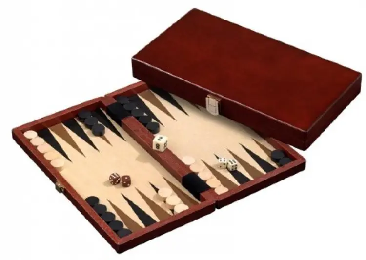 Kleine backgammon kassette, mahoni gebijtst, compleet met speelstenen, dobbelstenen. 280 x 150 x 35 mm.
