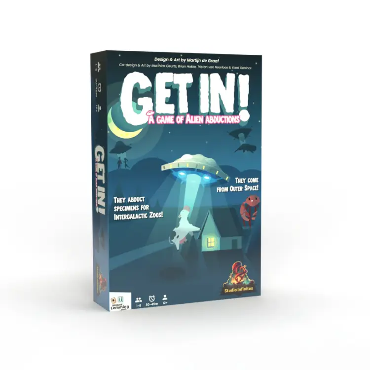 In dit humoristische gezelschapsspel kruipen spelers in de rol van aliens die met hun UFO’s mensen, dieren en alledaagse voorwerpen ontvoeren. Het spel draait om het populaire push-your-luck-mechanisme: je gooit de dobbelstenen om steeds meer buit te verzamelen, maar moet op het juiste moment stoppen. Ga je te ver, dan kun je alles van die ronde verliezen. Dankzij de eenvoudige spelregels is Get In! snel uit te leggen en direct te spelen. Waarom Get In! een ideaal bordspel is: Snel en toegankelijk dobbelspel Grappig alien-thema met veel humor Spannend push-your-luck spel met veel interactie Perfect als familiespel, partyspel of filler Door het compacte formaat en de hoge herspeelbaarheid is Get In! een uitstekend bordspel voor spelavonden, evenementen en casual spelers die houden van korte, leuke spellen. Durf jij nog één keer te gooien… of speel je op veilig? 🛸🎲