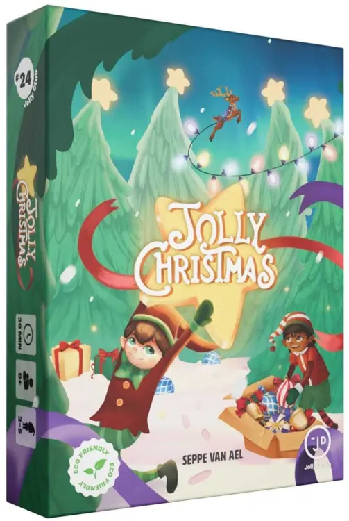 In Jolly Christmas heten we spelers welkom in de joligste tijd van het jaar, maar de kerstboom optuigen is toch een serieuze zaak. Spelers vullen hun kerstboom met volledige lampjes, slim geplaatste ornamenten en de beste piek op de top. Ze proberen ook op te letten wat hun tegenstanders nodig hebben zodat ze juist die kaarten voor hun neuzen weg kunnen pikken. Hoe werkt het spel? Elke speler maakt een eigen kerstboom door decoraties te verzamelen. Door het spel heen zullen spelers telkens hun elf bij één van de open decoratiekaarten leggen. De gekozen decoratiekaarten worden in de kerstbomen van de spelers geplaatst en nieuwe decoratiekaarten zullen opengedraaid worden. Spelers letten bij het plaatsen van de decoratiekaarten niet alleen op welke decoratie het is maar ook op de lampjes op de zijkanten van de kaarten. Wanneer de lampjes van verschillende kaarten op elkaar aansluiten levert dit bonuspunten op én een voordeel bij het kiezen van de piek voor op de top van de boom. De plaatsing van de elfjes bepaalt de spelersvolgorde voor de volgende ronde. Daardoor kan het slim zijn om een decoratiekaart te nemen die minder punten oplevert, als dat betekent dat de speler eerder aan de beurt is in de volgende ronde. Er worden veertien rondes gespeeld om zo de kerstbomen te vullen. Als laatst worden de pieken op de bomen geplaatst en worden de punten geteld. De speler met de meeste punten wint het spel!