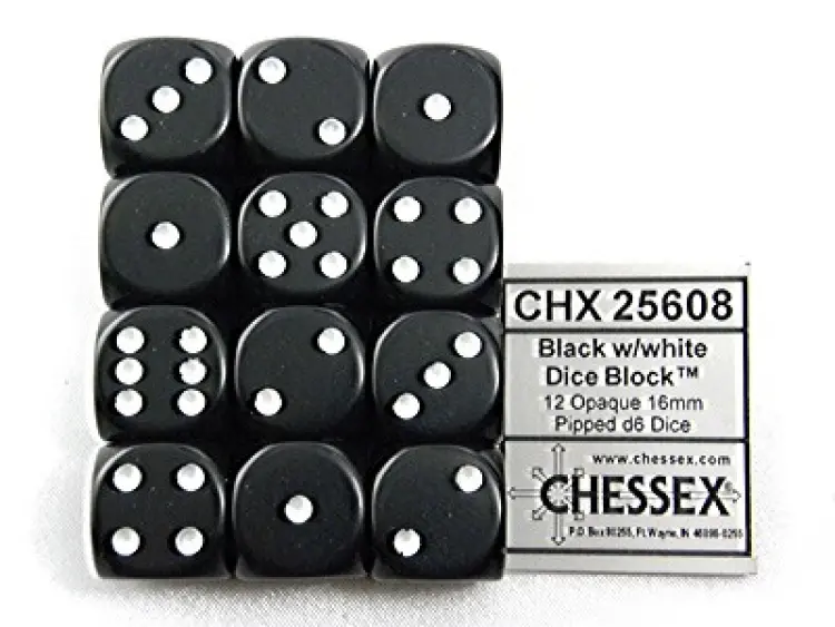 Opaque Black/white D6 16mm Dobbelsteen Set (12 stuks)