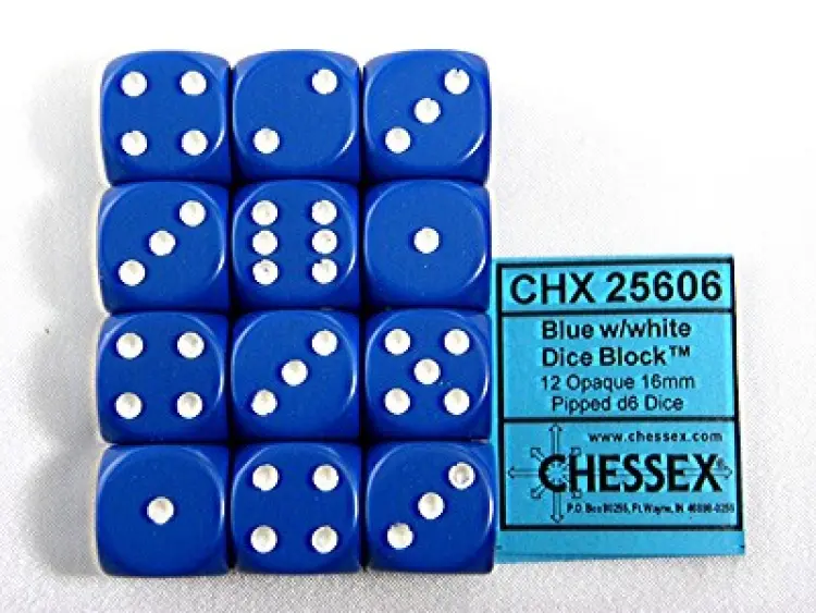 Opaque Blue/white D6 16mm Dobbelsteen Set (12 stuks)