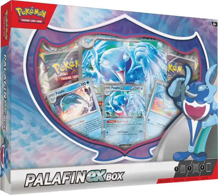 Als alles in de strijd verloren lijkt, roep dan een held op om de dag te redden! Met zijn Zero to Hero Ability kan Palafin een verbluffende transformatie maken in de krachtige Palafin ex, klaar om tegenstanders te slaan met de kracht van een oceaangolf. In deze box vind je Finizen, Palafin en Palafin ex als speelbare foil kaarten, een oversized versie van Palafin ex om tentoon te stellen en een handvol boosterpacks.