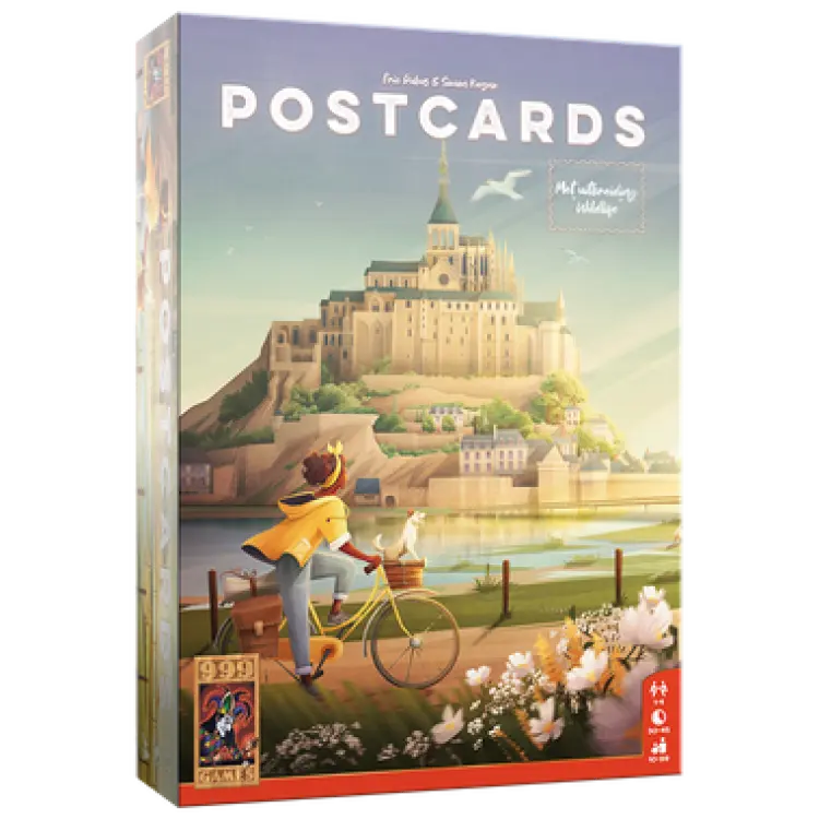 Postcards is een vrolijk bordspel waarin je op je fiets door 13 kleurrijke regio’s racet, op zoek naar de mooiste ansichtkaarten en unieke souvenirs. Zet tactisch je kamp op, plak postzegels, en deel als eerste je avonturen met het thuisfront. Elke ansichtkaart levert je punten en cadeaus op. Door je routes goed te plannen word jij misschien wel de beste reiziger van de regio! Postcards zit boordevol slimme keuzes, vrolijke illustraties en een flink gevoel van avontuur!
