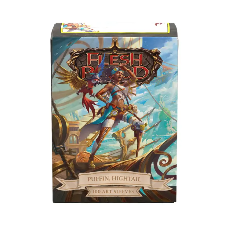 SLEEVES Flesh and Blood: Matte Art Puffin, Hightail (100) Arr ya ready for Puffin, Hightail, the new Flesh and Blood pirate hero? Aye? Then these Matte Art Sleeves are the perfect match for your deck! Matte sleeves are the fan-favorite sleeves players know and love. Forged with legendary durability and the textured back provides a supreme shuffle-feel as you face off against your opponents.